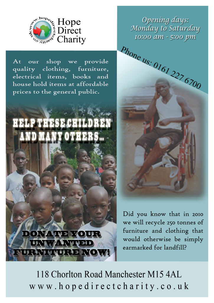 Hope Direct is a registered charity (number 1114725) set up to respond to the needs of some of the poorest children and families in Sierra Leone, Africa. As a charity based in Trafford, Manchester, Hope Direct also work with the local community within Trafford, Manchester by providing a meaningful voluntary occupation and one of the largest selections of furniture to purchase in the Manchester area, through our 13 thousand sq ft retail warehouse. Your donations are very valuable to us and all your help makes a huge difference in helping us to raise the funds we need to continue with our building of an orphanage. Items such as Clothes, Shoes, Handbags, Accessories, Books, CDs & DVDs, Toys and Furniture are all very much welcomed. We will arrange a free personal pick up of any donations you can make and also also offer reasonable delivery rates for any purchased items. To find out more about our work and our stock, please visit our website.