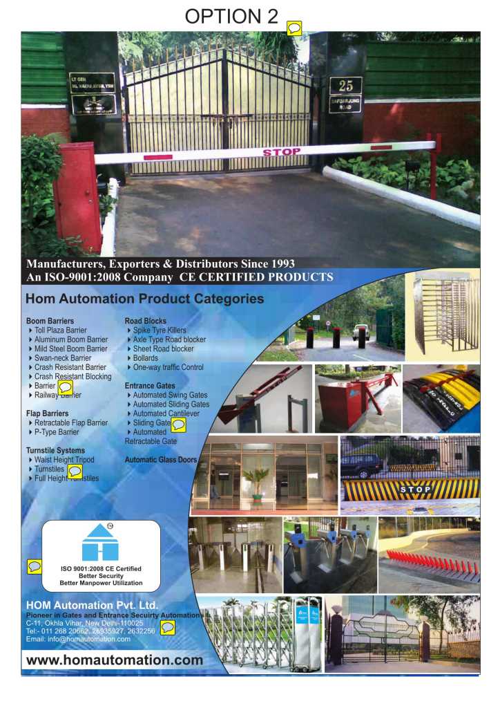 HOM Automation Pvt. Ltd. is a pioneer company in the field of Entrance Automation in India. It has been involved in manufacturing and marketing range of automatic entrance access systems since 1993. Being an ISO 9001:2008 company having CE certification, HOM prides itself in offering world-class products at unmatched prices with professional after sale essay services. Our clientele comprises of well-known companies in Security industry, system integrators and prestigious end-users from MNCs, to government and semi-government organizations. HOM Automatic Barriers, Gates and Doors Systems, Turnstiles and Roadblocks, Crash Resistant Blocking Bar, Bollards have been professionally designed and are manufactured under strict supervision and quality control to give them an edge in the global competition.